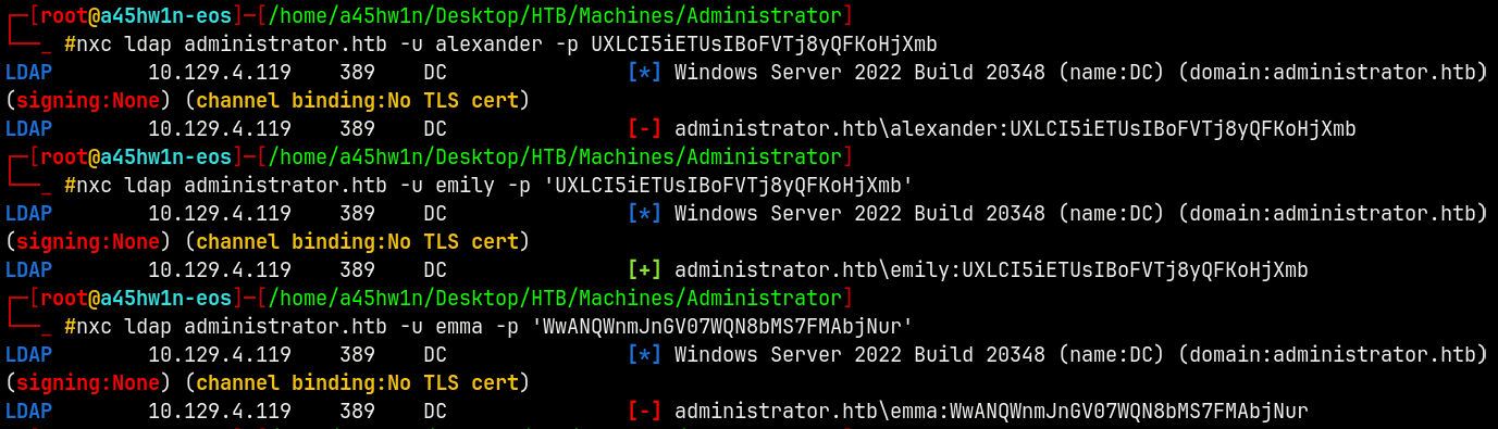 nxc ldap administrator.htb -u emily -p 'UXLCI5iETUsIBoFVTj8yQFKoHjXmb'