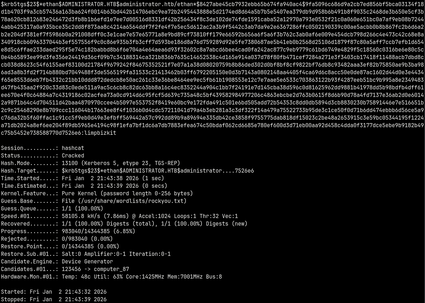 hashcat -m 13100 ethanhash.txt /usr/share/wordlists/rockyou.txt