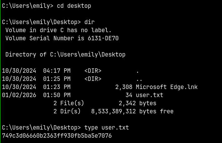We have valid creds for user Emily, marking them as owned in bloodhound.