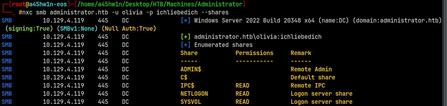 nxc smb administrator.htb -u olivia -p ichliebedich --shares