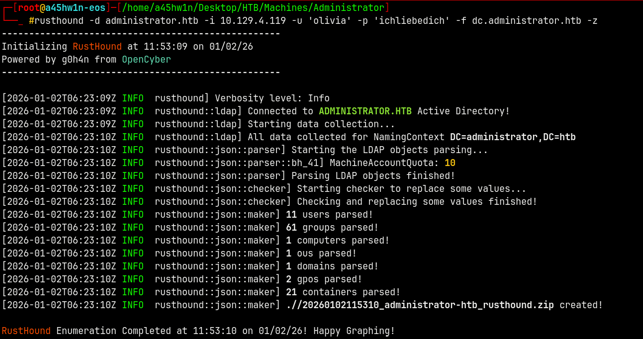 rusthound -d administrator.htb -i 10.129.4.119 -u 'olivia' -p 'ichliebedich' -f dc.administrator.htb -z