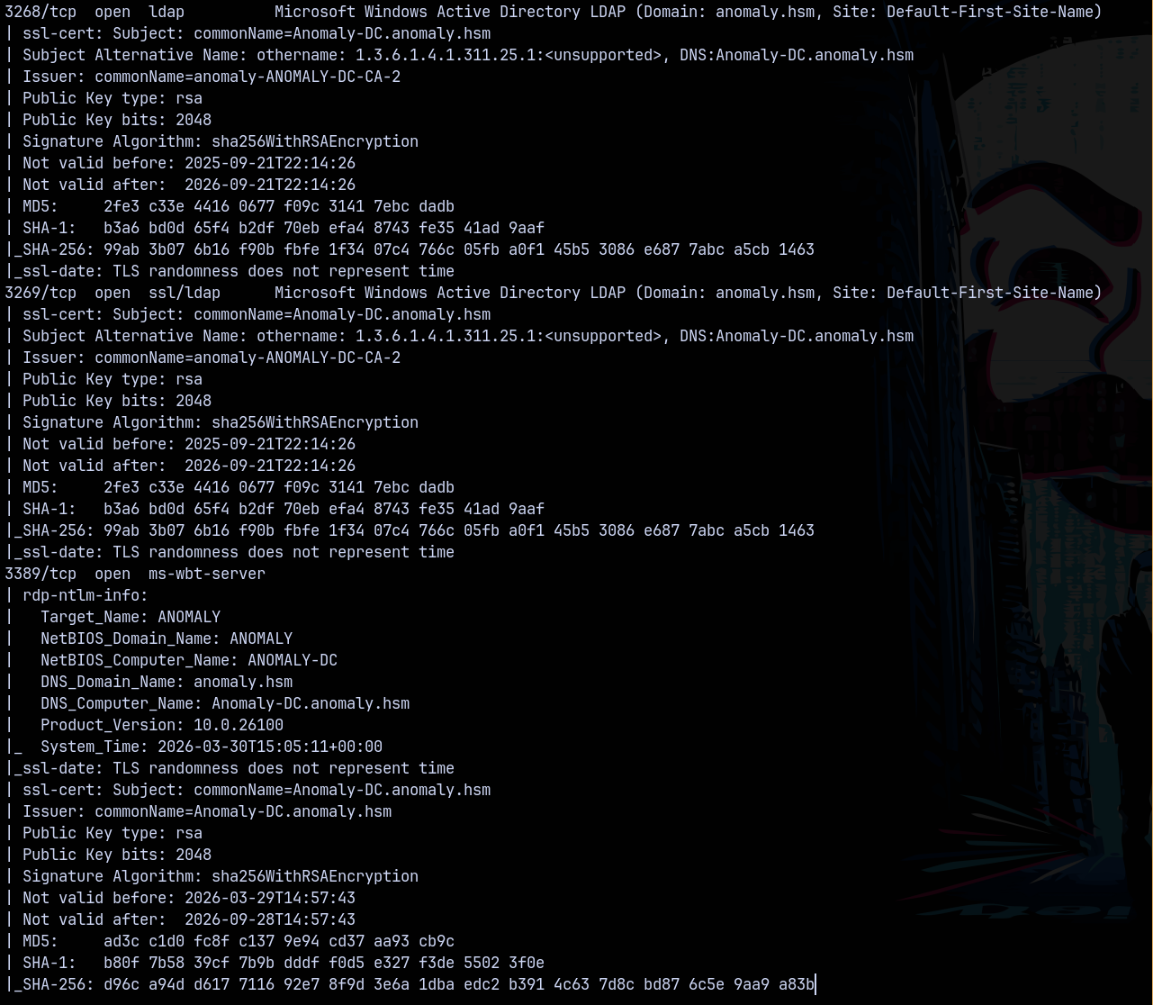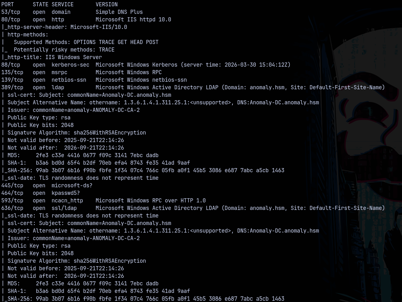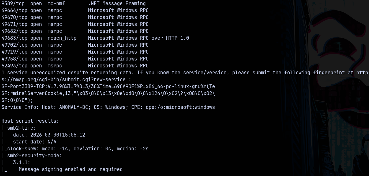 Scanning the DC, we found that it is running a active directory server and from the results we found that the domain name is anomaly.hsm and the FQDN be anomaly-dc.anomaly.hsm
