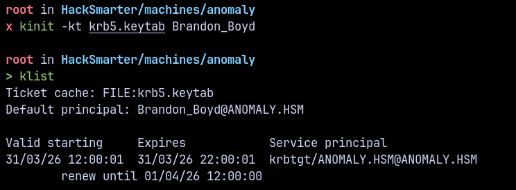 kinit -kt krb5.keytab Brandon_Boyd