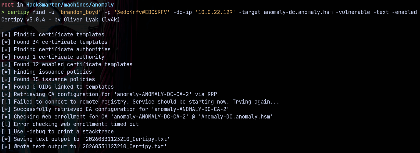 certipy find -u 'brandon_boyd' -p '3edc4rfv#EDC$RFV' -dc-ip '10.0.22.129' -target anomaly-dc.anomaly.hsm -vulnerable -text -enabled