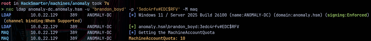 nxc ldap anomaly-dc.anomaly.hsm -u 'brandon_boyd' -p '3edc4rfv#EDC$RFV' -M maq