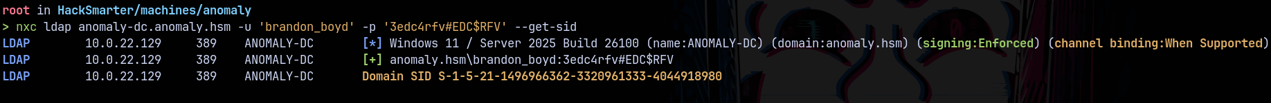 nxc ldap anomaly-dc.anomaly.hsm -u 'brandon_boyd' -p '3edc4rfv#EDC$RFV' --get-sid