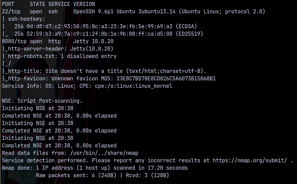 Looking at the results we only have 2 ports open on the box which is ssh and port 8080 running a jetty server version 10.0.20.