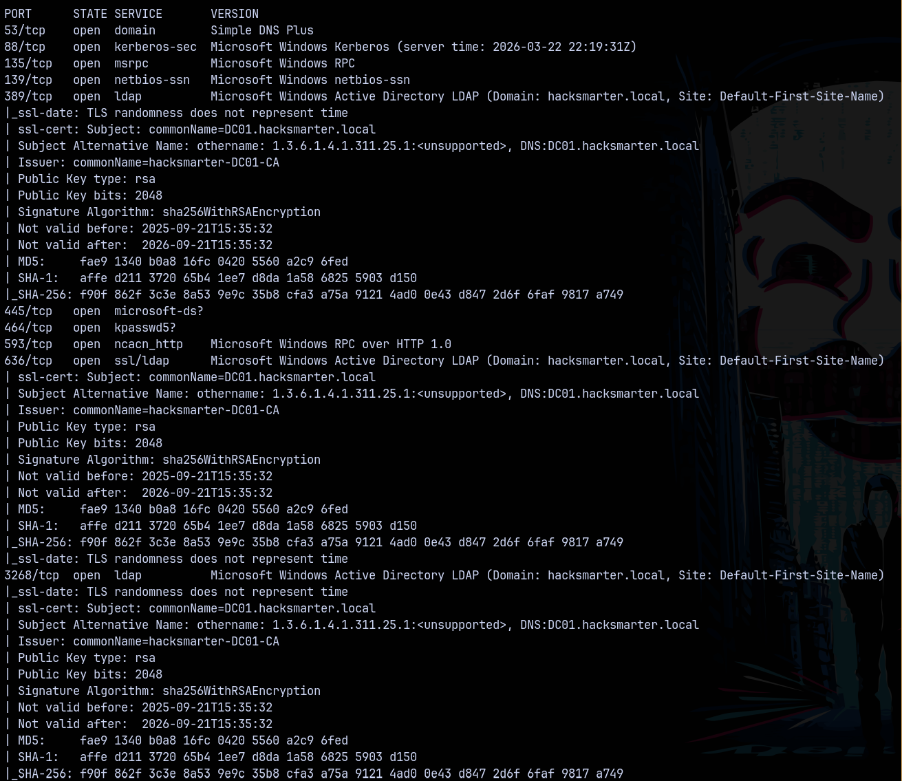 Identified that the DC01 is the domain controller name and the domain is hacksmarter.local