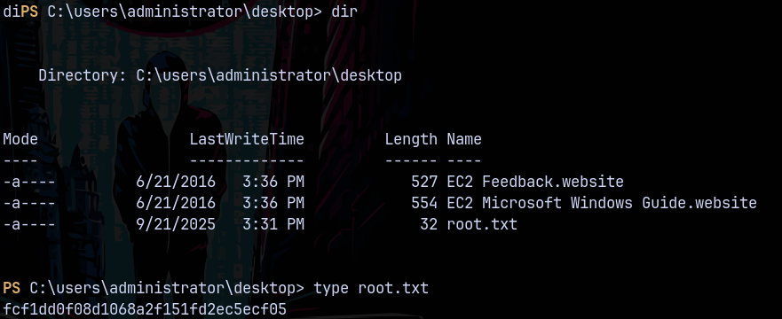 Claiming the root.txt from the administrator’s desktop.