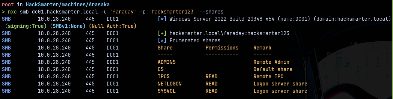 nxc smb dc01.hacksmarter.local -u 'faraday' -p 'hacksmarter123' --shares