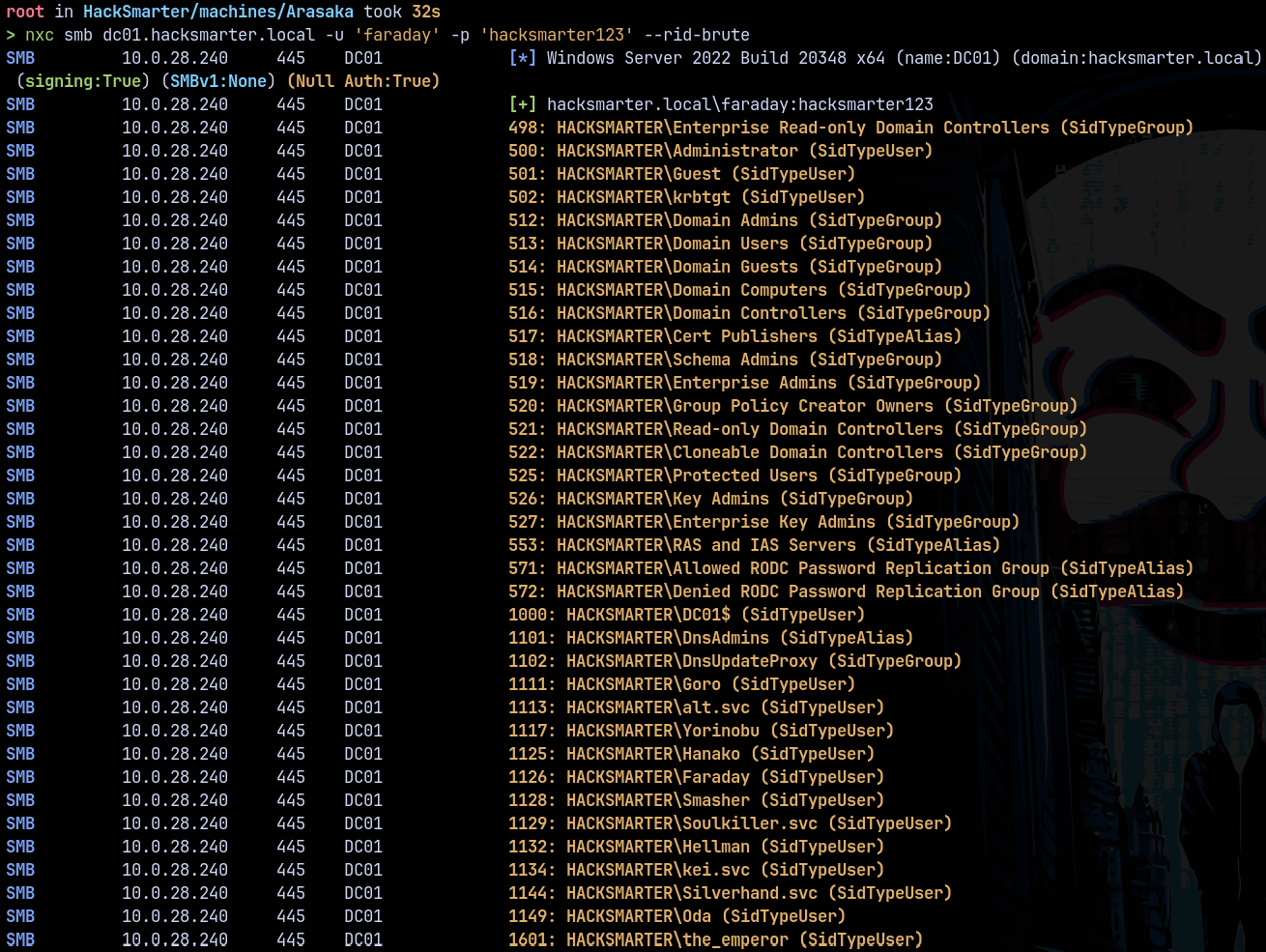 nxc smb dc01.hacksmarter.local -u 'faraday' -p 'hacksmarter123' --rid-brute