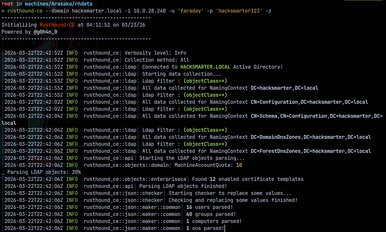 rusthound-ce --domain hacksmarter.local -i 10.0.28.240 -u 'faraday' -p 'hacksmarter123' -z