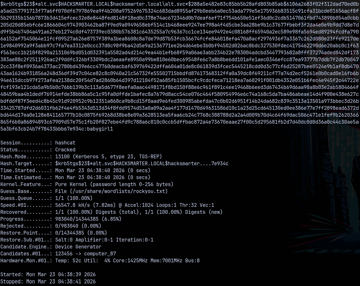 hashcat -m 13100 kerberoastable.txt /usr/share/wordlists/rockyou.txt