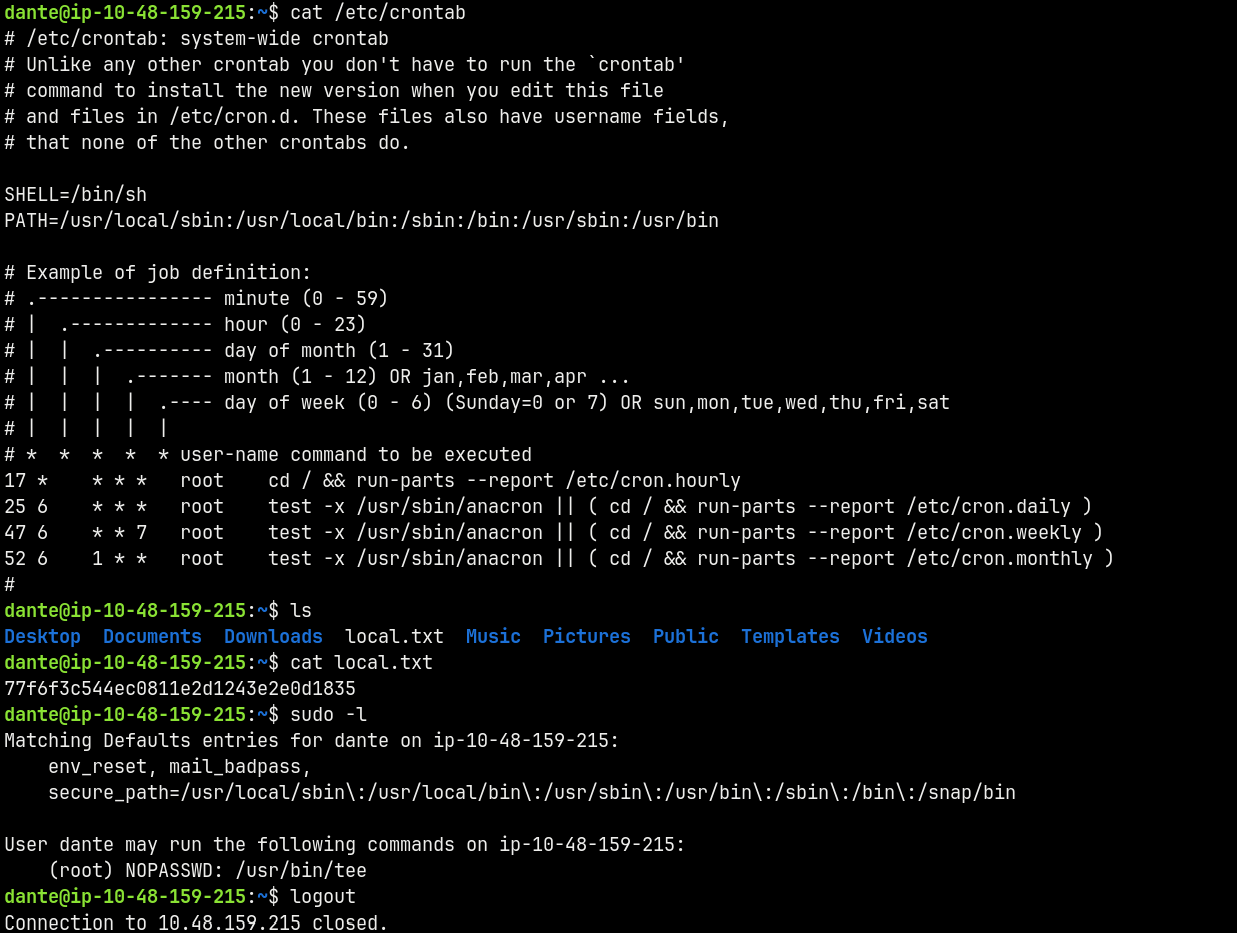 Basically what we did is we create a password hash for “dante” as the password and replaced it in /etc/passwd since we have write permissions with tee.