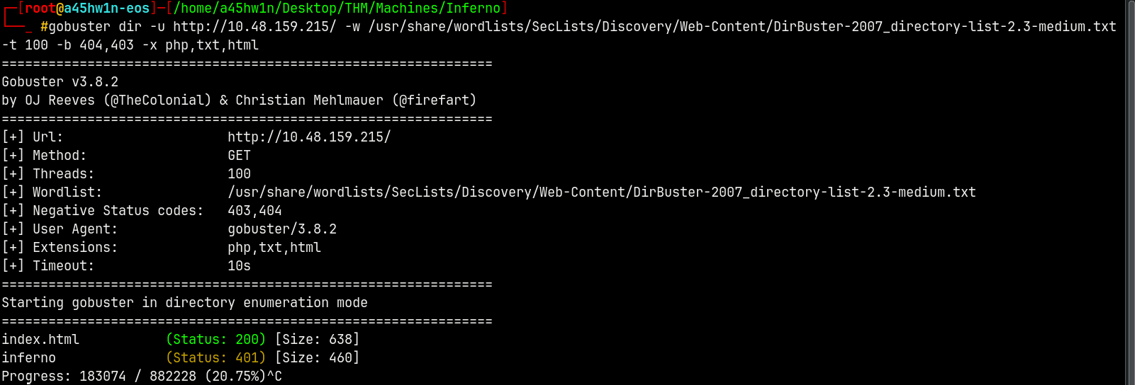gobuster dir -u http://10.48.159.215/ -w /usr/share/wordlists/SecLists/Discovery/Web-Content/DirBuster-2007_directory-list-2.3-medium.txt -t 100 -b 404,403 -x php,txt,html