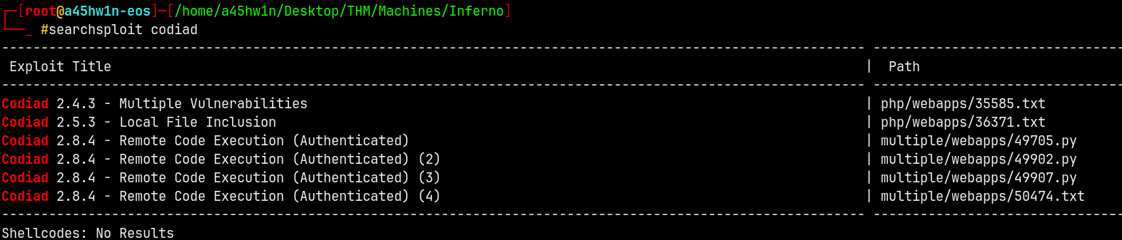 Inferno is a medium difficulty THM machine which focuses on a CVE within codiad a cloud based IDE, we get a shell on the box by exploiting this CVE and also the privesc can be done as the SUID bit is set on the tee binary, which lets us login as root and pwn this box.