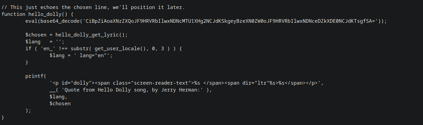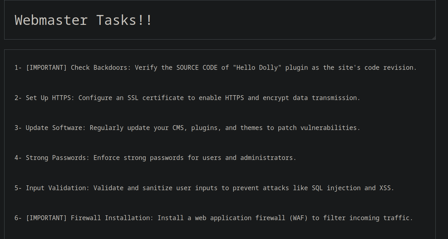 Opening the Webmaster tasks!, we have this page which gives us a hint about a plugin named Hello Dolly.