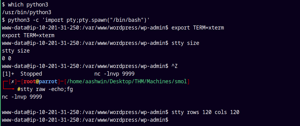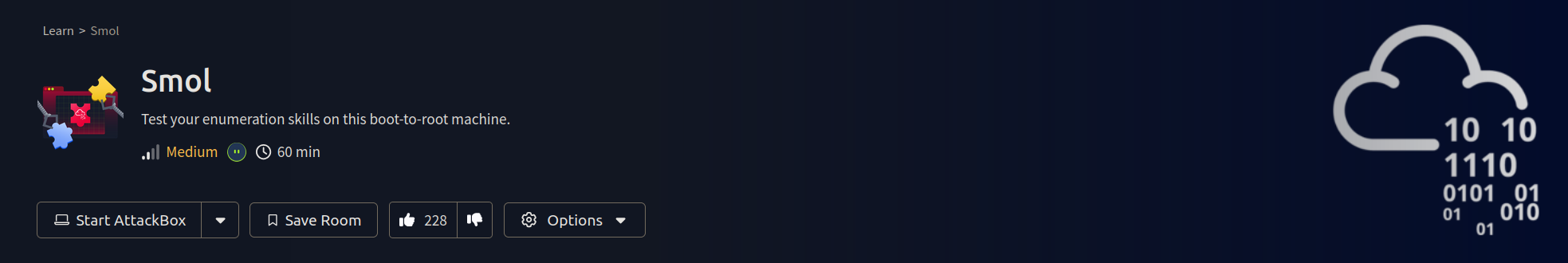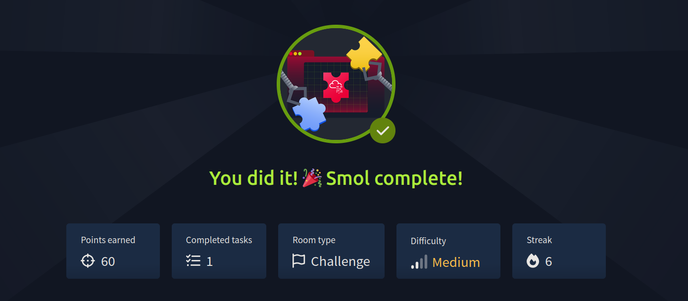 SMOL is an medium level box from TryHackMe which focusses on WordPress exploitation, an vulnerable plugin is running on the machine which allows us to do LFI and gain potential creds of the wordpress login which then allows us to upload a file on the server giving us shell on the box as www-data user and through some lateral movement, the last user has rights to run everything as root helping us pwn this box.