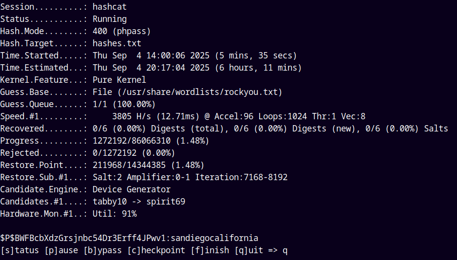 hashcat -m 400 hashes.txt /usr/share/wordlists/rockyou.txt