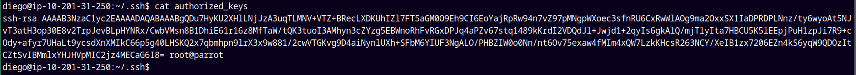 Now I will paste my id_rsa.pub key in the authorized_keys file and place it inside /home/diego/.ssh/