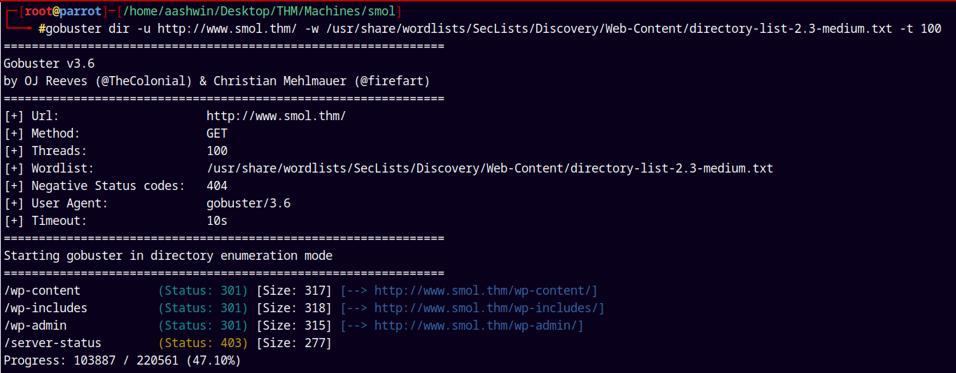 gobuster dir -u http://www.smol.thm/ -w /usr/share/wordlists/SecLists/Discovery/Web-Content/directory-list-2.3-medium.txt -t 100