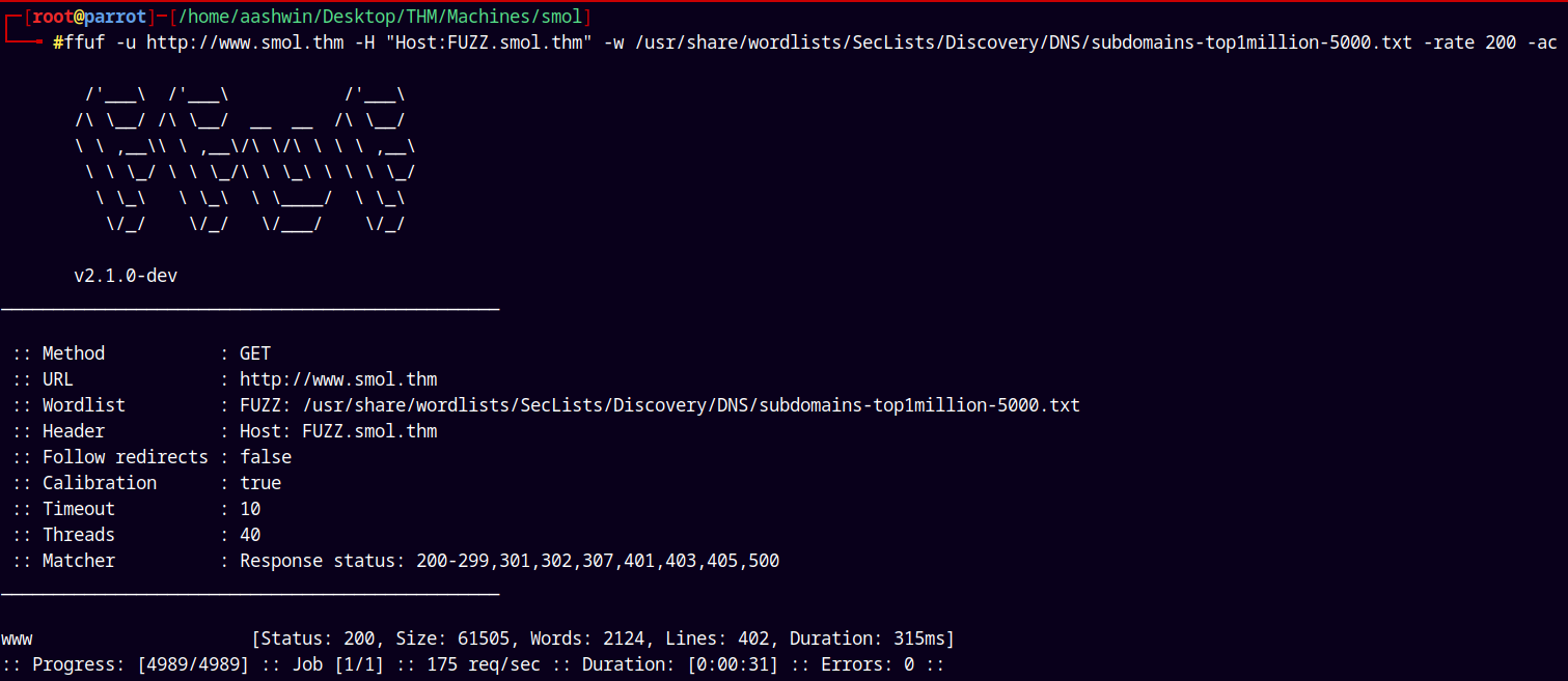 ffuf -u http://www.smol.thm -H "Host:FUZZ.smol.thm" -w /usr/share/wordlists/SecLists/Discovery/DNS/subdomains-top1million-5000.txt -rate 200 -ac