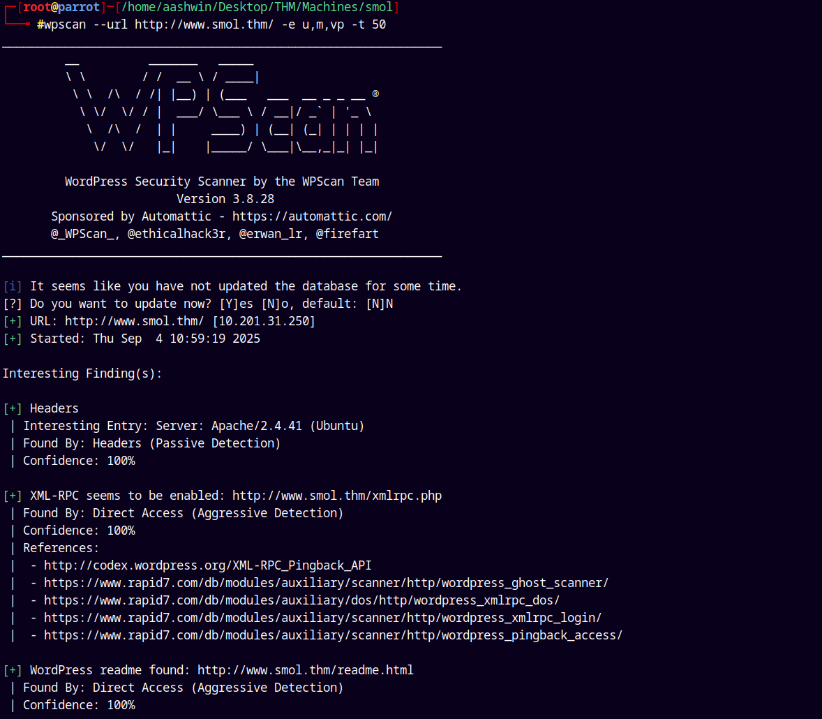 wpscan --url http://www.smol.thm/ -e u,m,vp -t 50