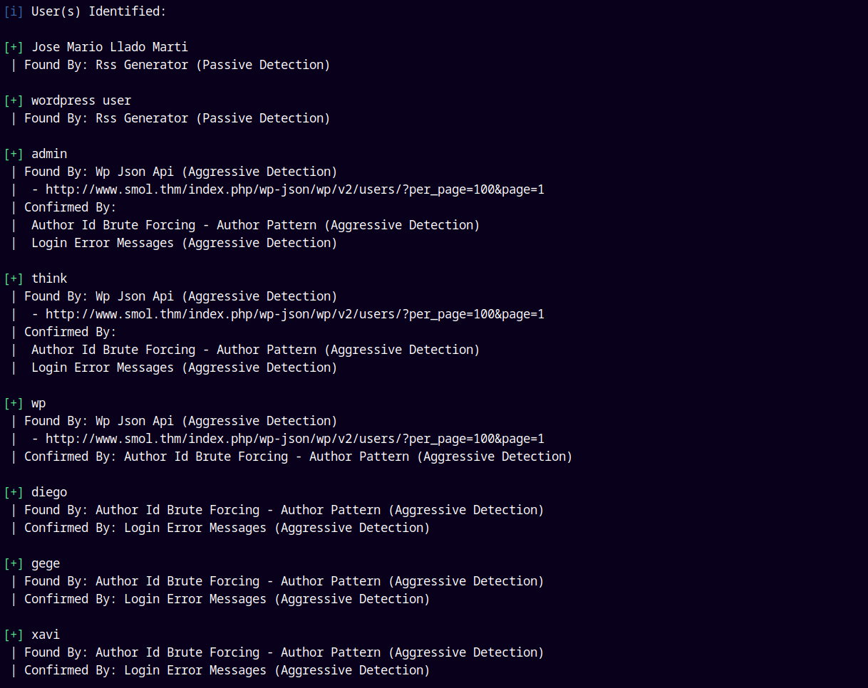 INSERT INTO `wp_users` VALUES (1,'admin','$P$Bvi8BHb84pjY/Kw0RWsOXUXsQ1aACL1','admin','admin@smol.thm','http://192.168.204.139','2023-08-16 06:58:30','',0,'admin'),(2,'wpuser','$P$BfZjtJpXL9gBwzNjLMTnTvBVh2Z1/E.','wp','wp@smol.thm','http://smol.thm','2023-08-16 11:04:07','',0,'wordpress user'),(3,'think','$P$B0jO/cdGOCZhlAJfPSqV2gVi2pb7Vd/','think','josemlwdf@smol.thm','http://smol.thm','2023-08-16 15:01:02','',0,'Jose Mario Llado Marti'),(4,'gege','$P$BsIY1w5krnhP3WvURMts0/M4FwiG0m1','gege','gege@smol.thm','http://smol.thm','2023-08-17 20:18:50','',0,'gege'),(5,'diego','$P$BWFBcbXdzGrsjnbc54Dr3Erff4JPwv1','diego','diego@smol.thm','http://smol.thm','2023-08-17 20:19:15','',0,'diego'),(6,'xavi','$P$BvcalhsCfVILp2SgttADny40mqJZCN/','xavi','xavi@smol.thm','http://smol.thm','2023-08-17 20:20:01','',0,'xavi');