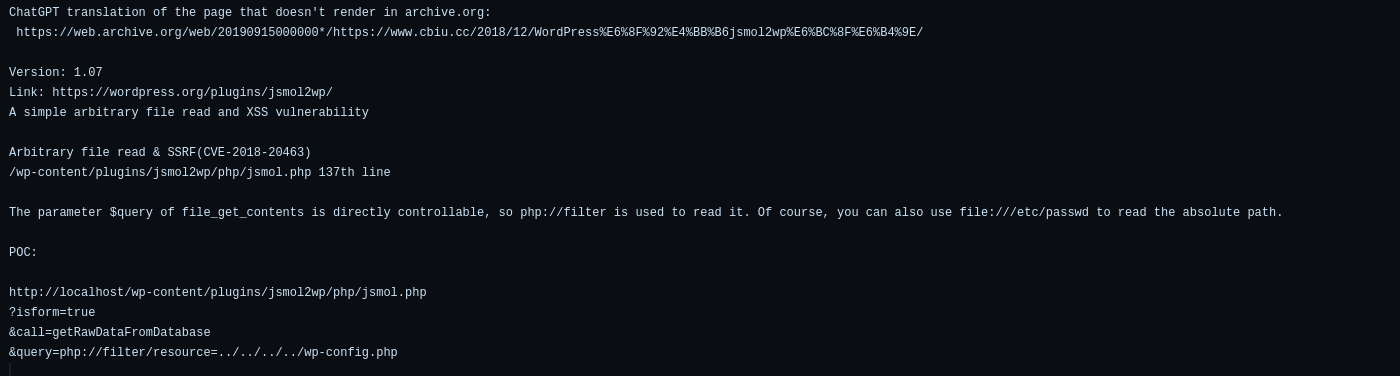https://github.com/sullo/advisory-archives/blob/master/wordpress-jsmol2wp-CVE-2018-20463-CVE-2018-20462.txt?source=post_page-----fbd2a0ddf9ce---------------------------------------