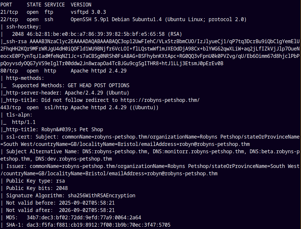 There is also a potential email address found in the scan → robyn@robyns-petshop.thm